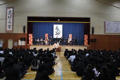 「あべや」による津軽三味線・民謡が行われました。演奏だけでなくわかりやすく面白い説明で、演者と観客が一体となり、あっという間に90分が過ぎました。終了後フォームによる振り返りを行いましたが、生徒からは多くの好意的な声が寄せられました。
